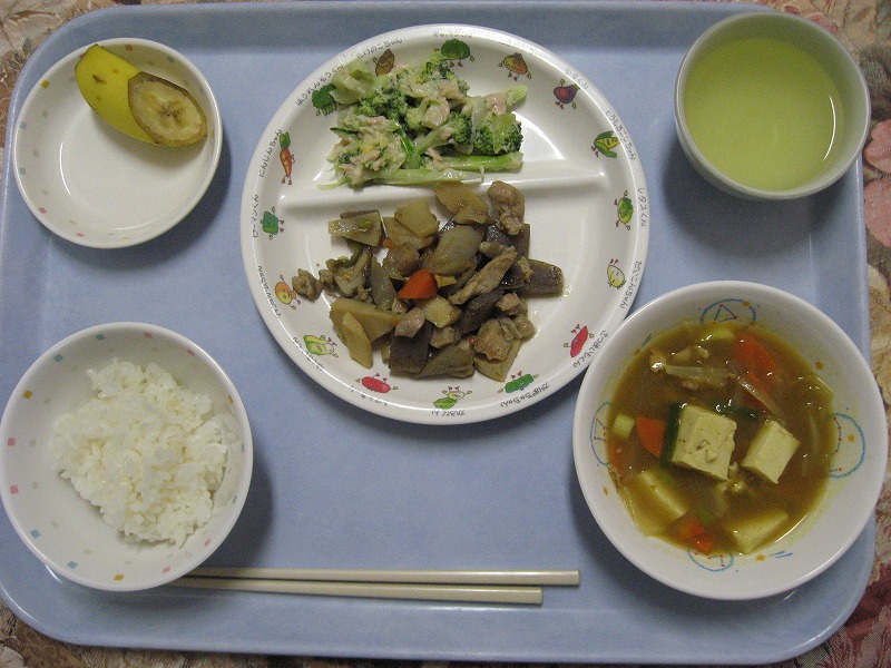 筑前煮(鶏肉・竹の子・にんじん・ごぼう・れんこん・こんにゃく・いんげん) キャベツサラダ(キャベツ・きゅうり・にんじん・プロッコリー) 豆腐カレースープ(豆腐・豚肉・玉ねぎ・にんじん・しいたけ・ねぎ・カレー粉)