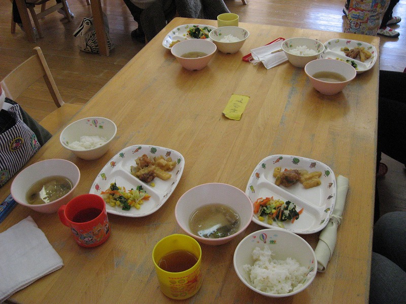 使用食材は、 ・鶏肉とポテトの揚げ煮(鶏肉・玉ねぎ・にんじん・ピーマン・フライドポテト) ・ほうれん草ナムル(ほうれん草・キャベツ・もやし・にんじん・コーン・ごま) ・ワンタンスープ(ワンタン・かまぼこ・はくさい・しめじ・ねぎ) 今日は、南・北保育園で、年少の親子給食会がありました。園児は朝からとても楽しみにしていて、いつもよりお行儀よく、はりきって食べていました。