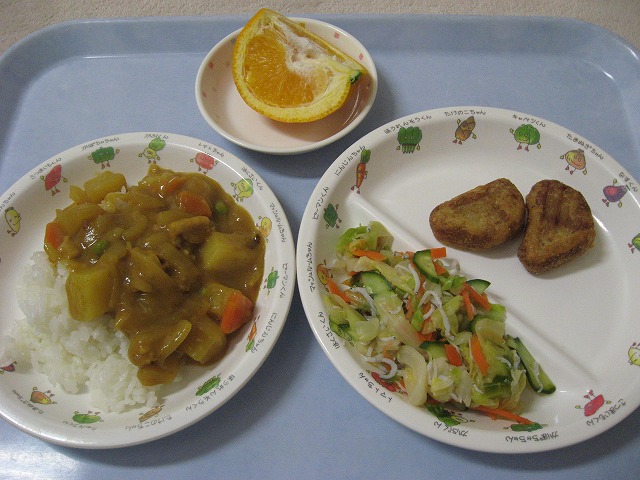 3月7日(月) 給食 ・カレーライス ・キャベツの甘酢あえ ・おさかなナゲット ・いよかん