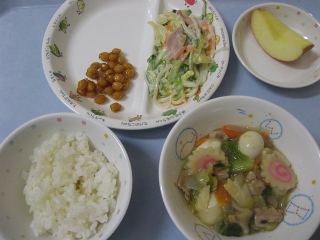 3月16日(水) 給食 ・ごはん ・八宝菜 ・春雨サラダ ・大豆の甘煮 ・りんご