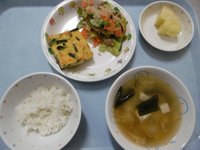 3月1日(水)給食 ・ごはん ・千草焼き ・キャベツのサラダ ・みそ汁 ・パイナップル