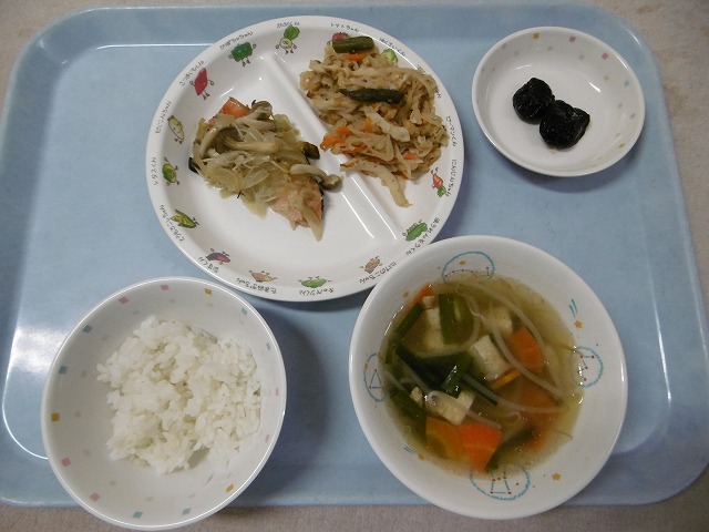 9月6日(水)給食 ・ごはん ・鮭のきのこ焼き(鮭・しめじ・えのきたけ・玉ねぎ) ・切干大根の煮物(切干大根・油揚げ・ちくわ・にんじん・いんげん) ・もやしスープ(もやし・鶏肉・豆腐・にら・にんじん) ・プルーン