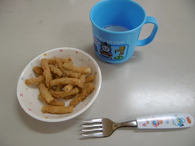 おやつ『マカロニあべかわ』 マカロニを茹でて、きな粉・砂糖・塩をまぜたものにマカロニを入れて混ぜます。