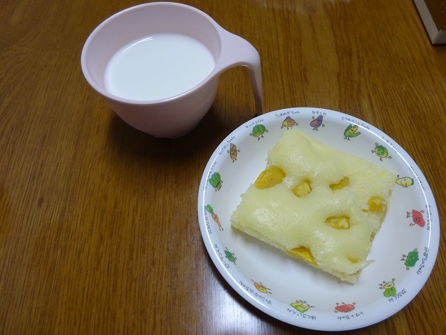 おやつは、「くり蒸しパン」 材料は、 ホットケーキミックス、栗の甘煮、砂糖、スキムミルク 今日の蒸しパンには、栗が入っていました。さつまいもやかぼちゃ、にんじんなどを入れて 蒸しパンを作ってみてください。