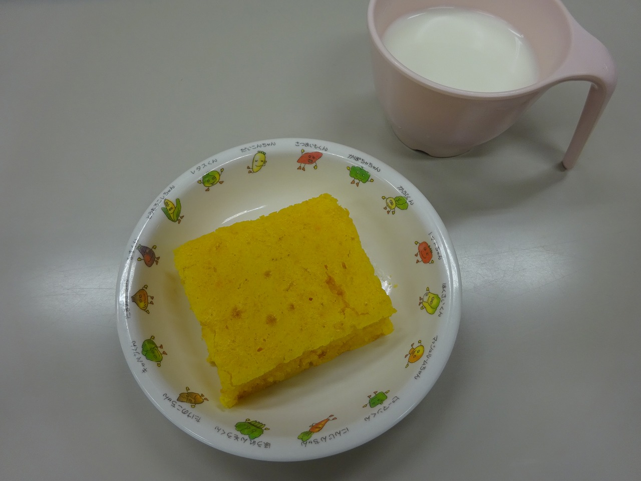『キャロットケーキ』 ホットケーキミックスにすりおろしたにんじん、5㎜角チーズ、卵、バター、砂糖を混ぜて焼きました。