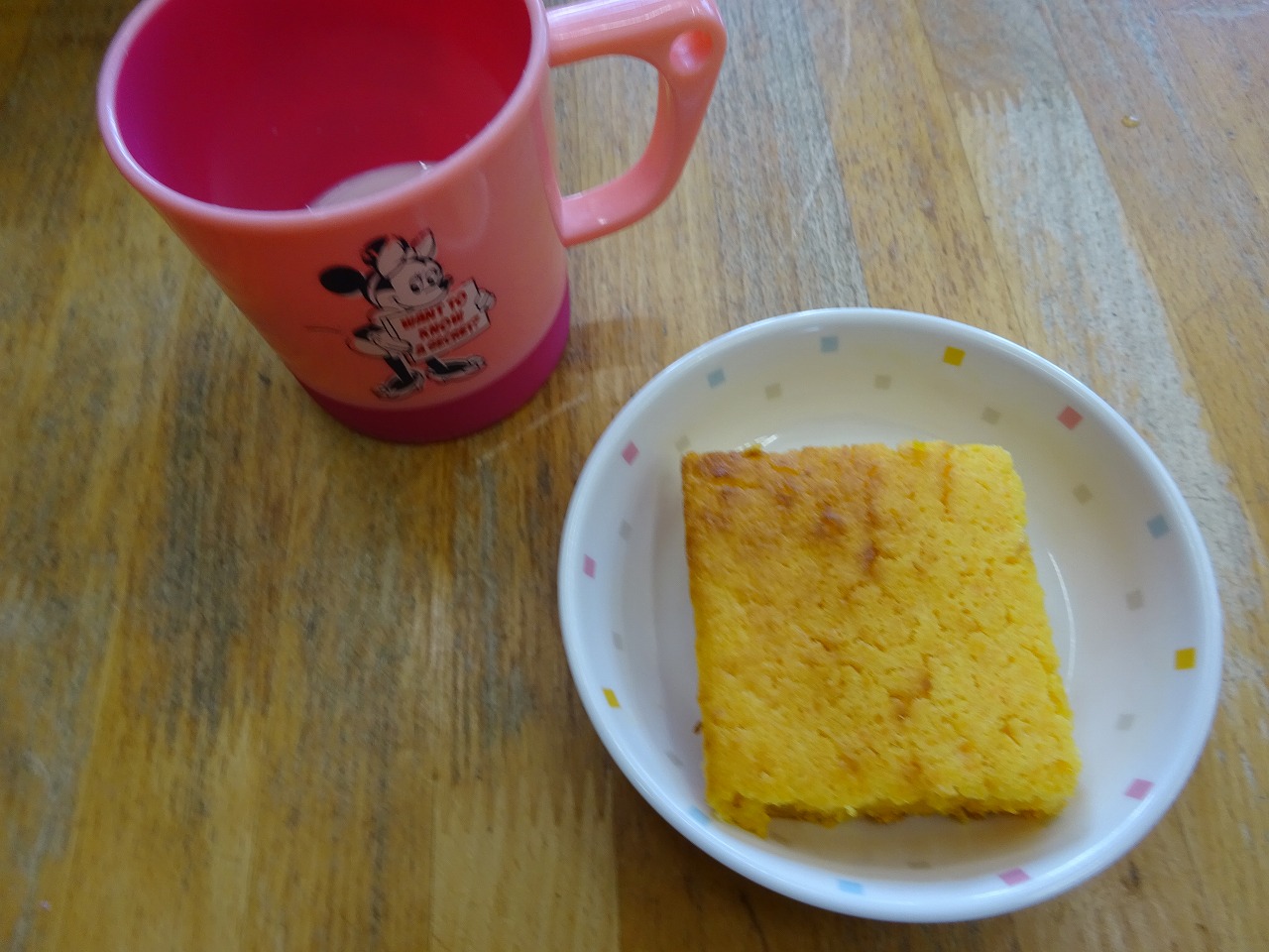 7月28日(水)給食 と おやつ ・牛丼(米・牛肉・玉ねぎ・小松菜・しらたき・ねぎ) ・フレンチサラダ(キャベツ・きゅうり・にんじん・ブロッコリー) ・大豆の甘煮 ・バナナ おやつは、『キャロットケーキ』 ホットケーキミックス、卵、バター、スキムミルク、水、にんじんのすりおろしを混ぜて、焼きました。
