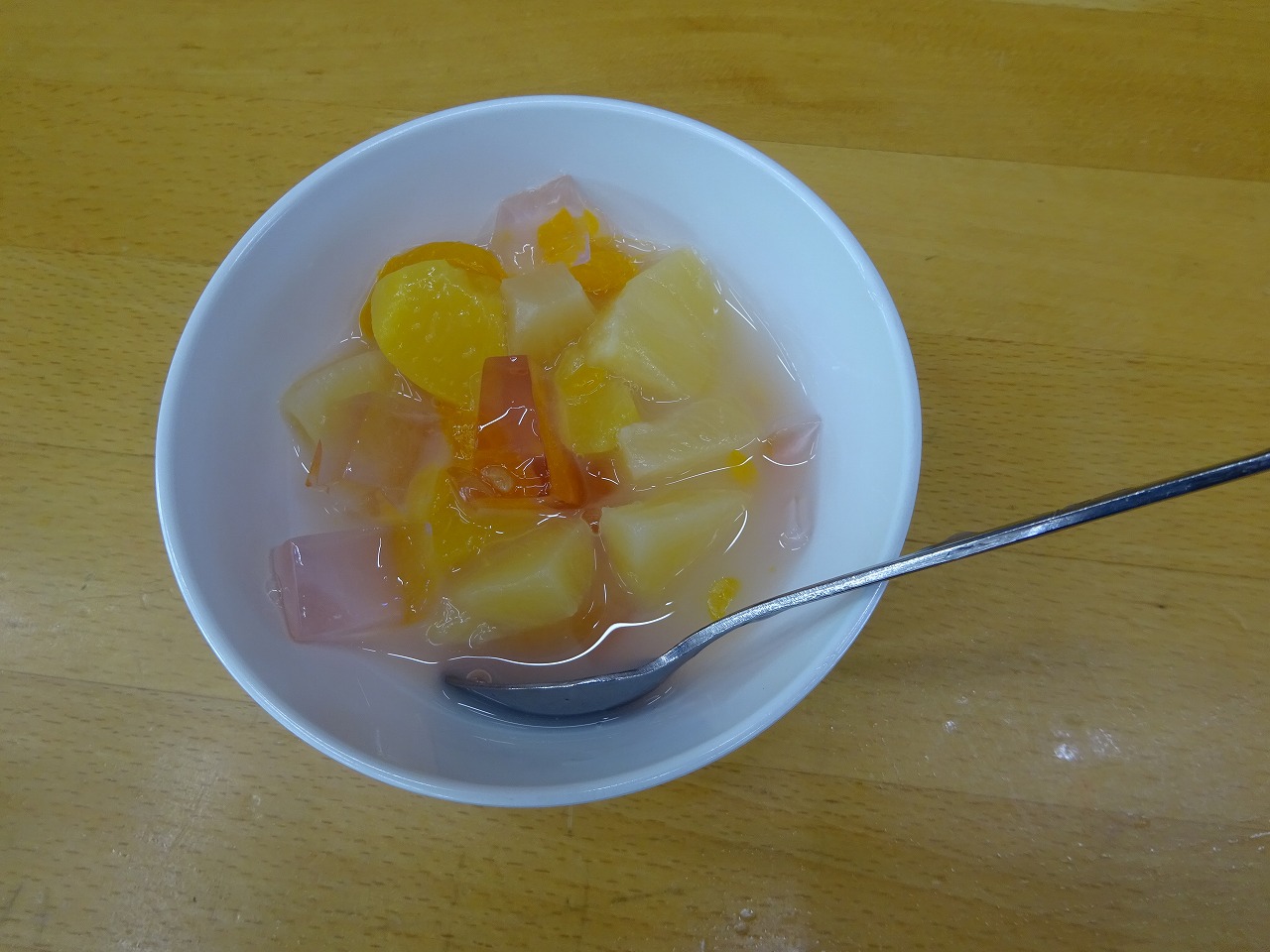 9月6日(月)給食 と おやつ ・ごはん ・鶏肉のパン粉焼き ・ひじきの炒り煮(ひじき・油揚げ・ちくわ・にんじん・いんげん) ・すまし汁(豆腐・小松菜・玉ねぎ・にんじん・えのきたけ) ・オレンジ 今日のおやつは、『カルピスポンチ』 くだものとゼリーを盛り、カルピスウォーターを入れました。