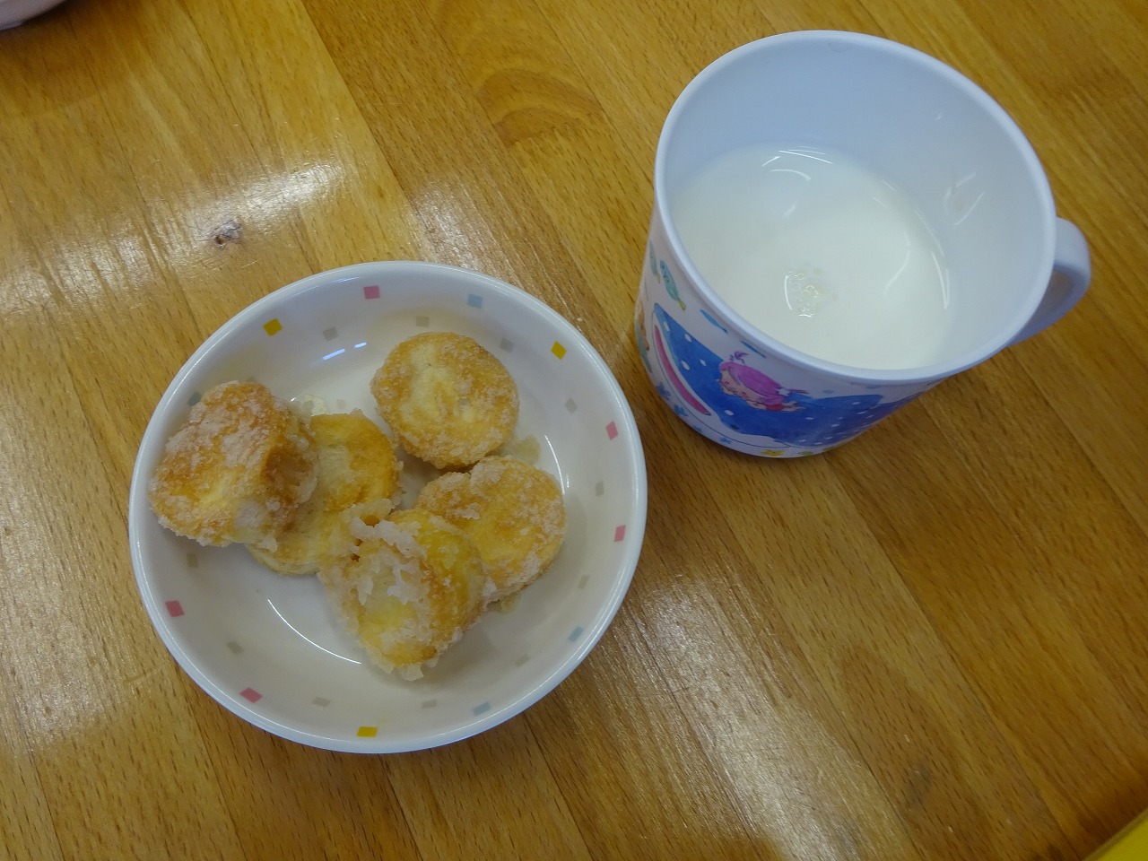 『お麩のラスク』 お麩 、マーガリン(卵乳なし)、砂糖で作りました。 園児からは、サクサクして、おいしかったよ〜の声がありました。