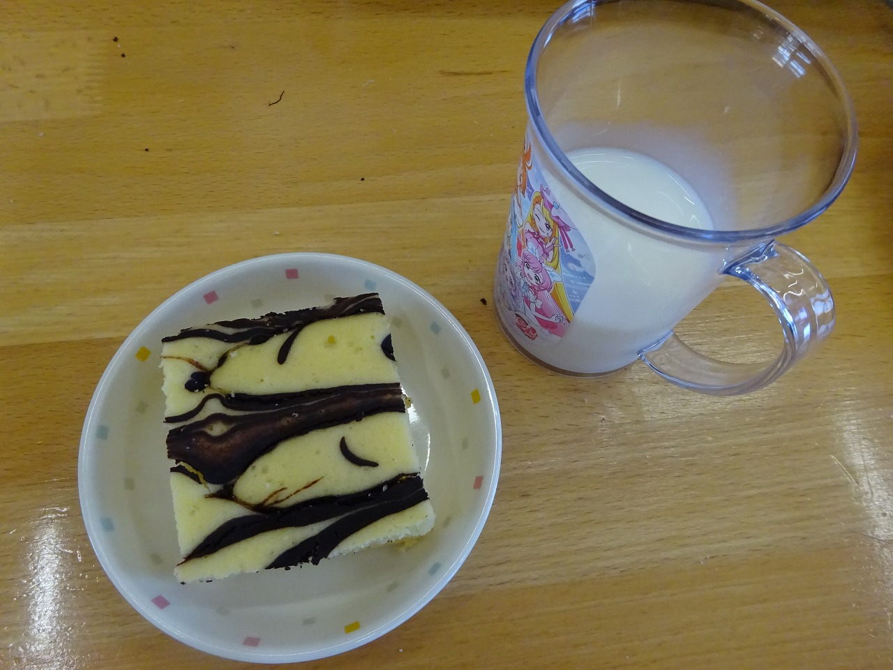 おやつは、『マーブルケーキ』 ホットケーキミックス、バター、卵、砂糖を混ぜる。1/3量の生地を取り分け、ココアを混ぜ合わせる。 オーブンシートに2種類の生地を入れ、マーブル模様を作り、オーブンで焼きます。
