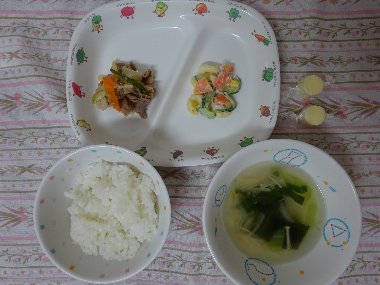 7月10日(月)給食 ・ごはん ・ホイコーロー ・マカロニサラダ ・中華スープ ・チーズ