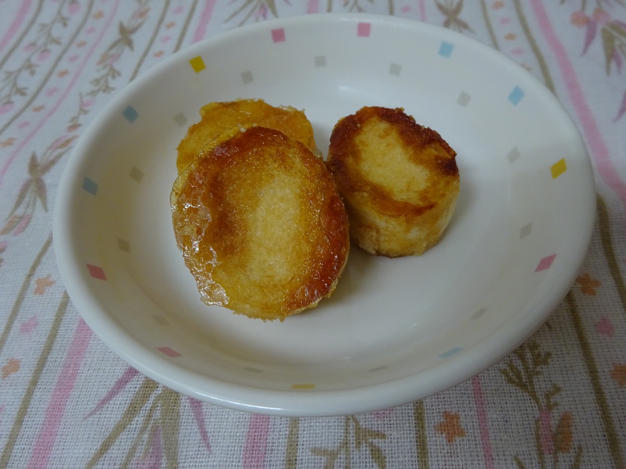 おやつ「お麩ラスク」 材料:お麩・マーガリン・砂糖 作り方:①マーガリンを溶かす ②①と砂糖を混ぜる ③②にお麩をいれて混ぜ、オーブン180℃で10分ほど焼く (※焦げないよう焼く時間は様子をみながら)