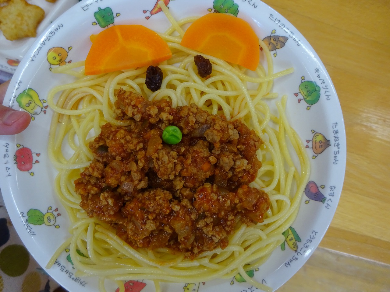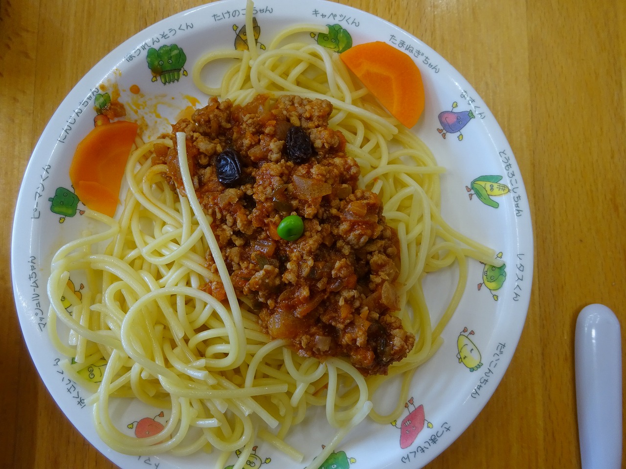 今日の給食は自分たちで飾り付ける「くまさんのミートスパゲッティ」でした。 耳に人参、目はレーズン、鼻はグリンピースです。 園児は各自独創的なくまさんをつくっていました。