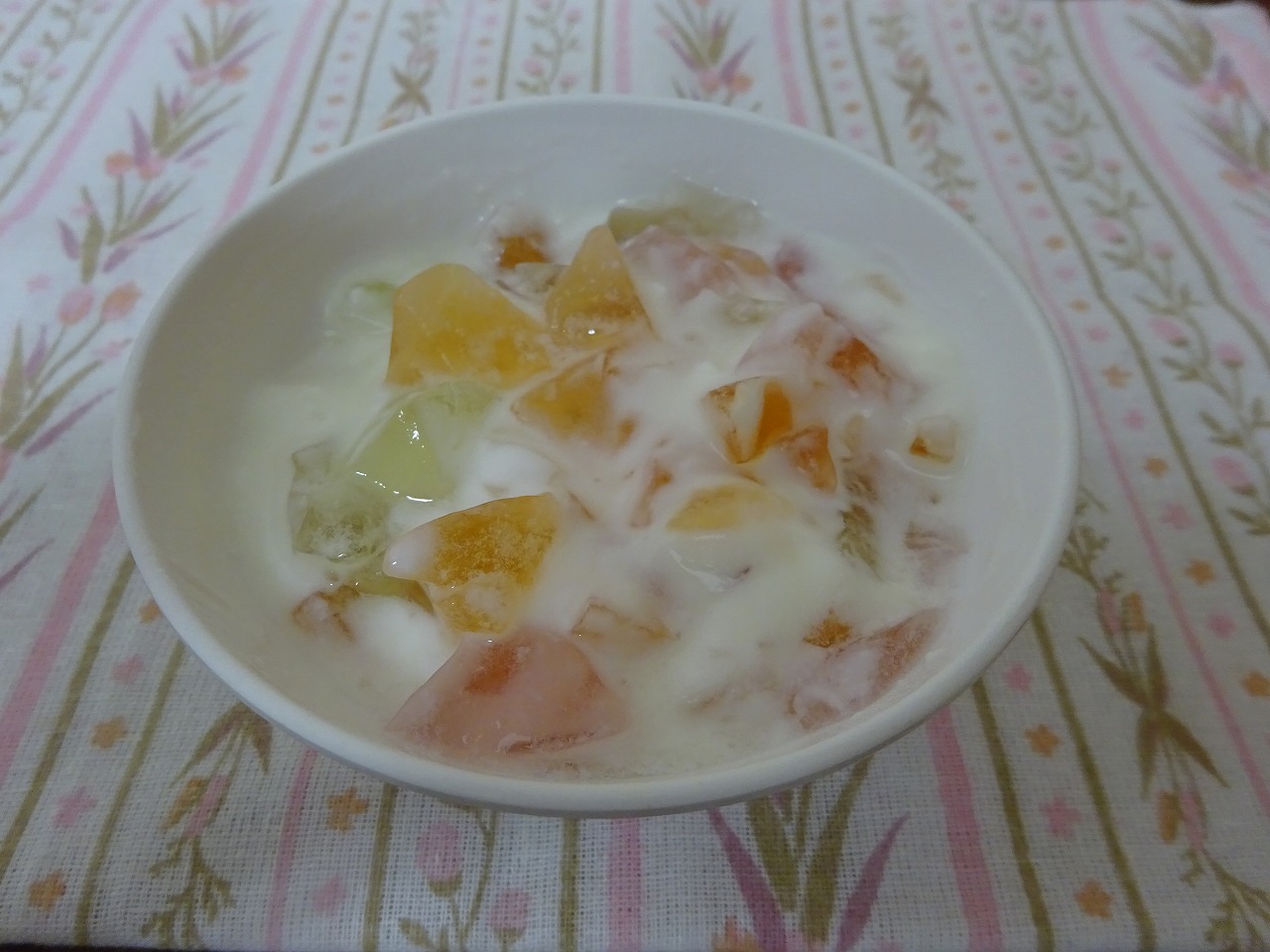 今日のおやつ「ゼリーのヨーグルト和え」