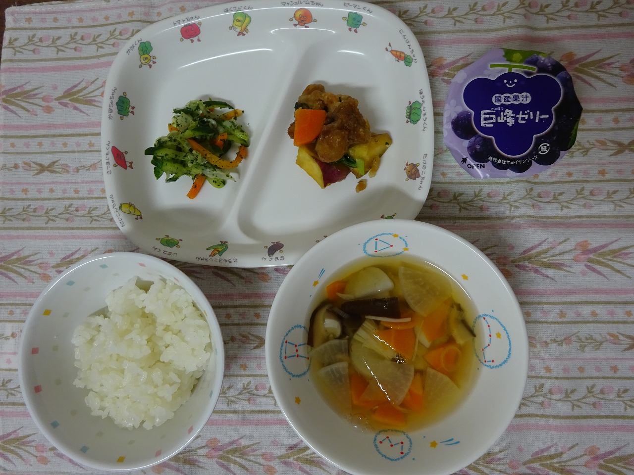 10月20日(金)給食 ・ごはん(いのちの壱) ・鶏肉の揚げ煮 ・キャベツのかおり和え ・秋のきのこ汁 ・巨峰ゼリー
