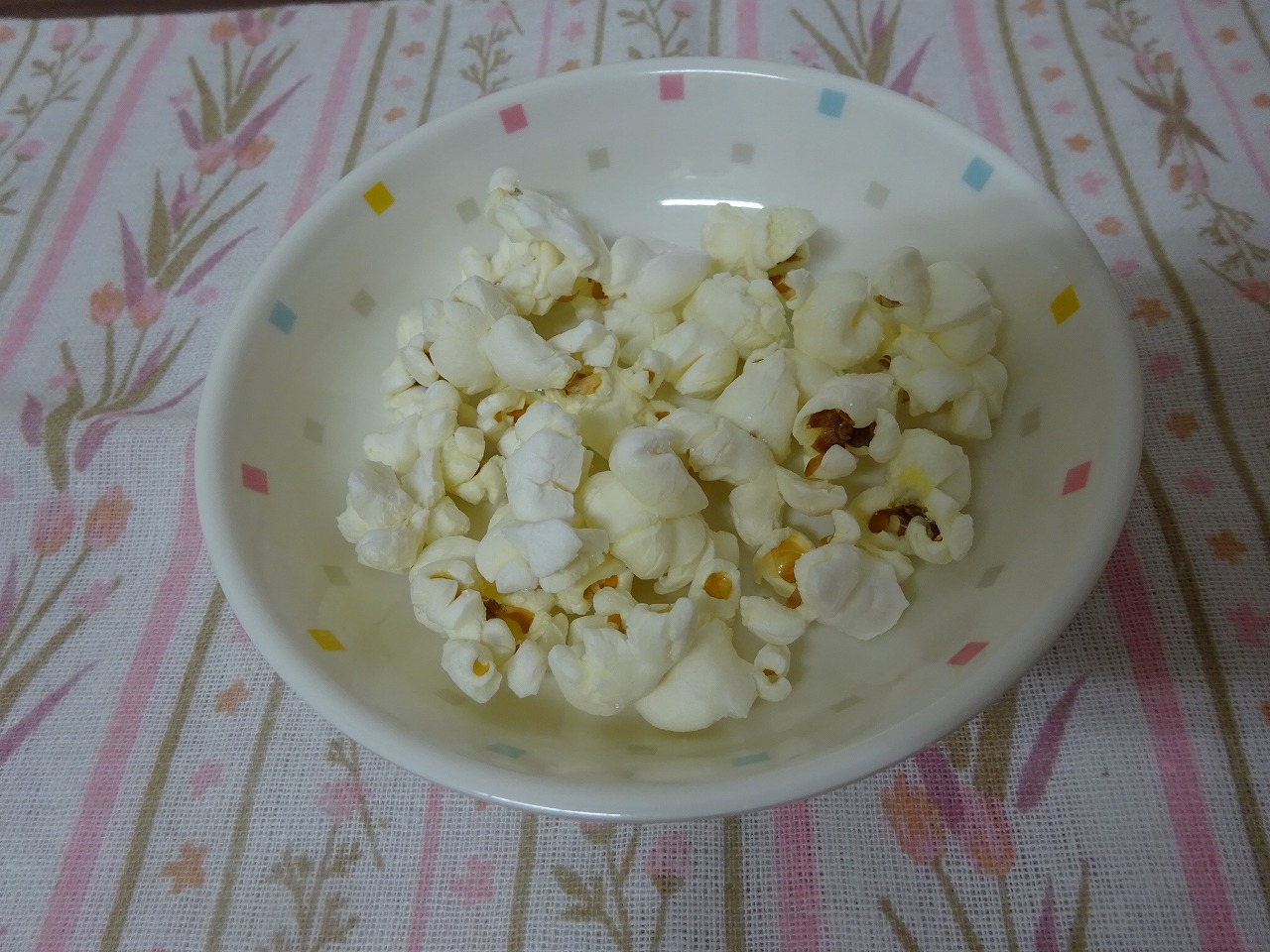今日のおやつ「手作りポップコーン(塩味)」 今日のポップコーンの実は、年中さんが畑で育てた物を使用しました。 作りたての温かいポップコーンでした。
