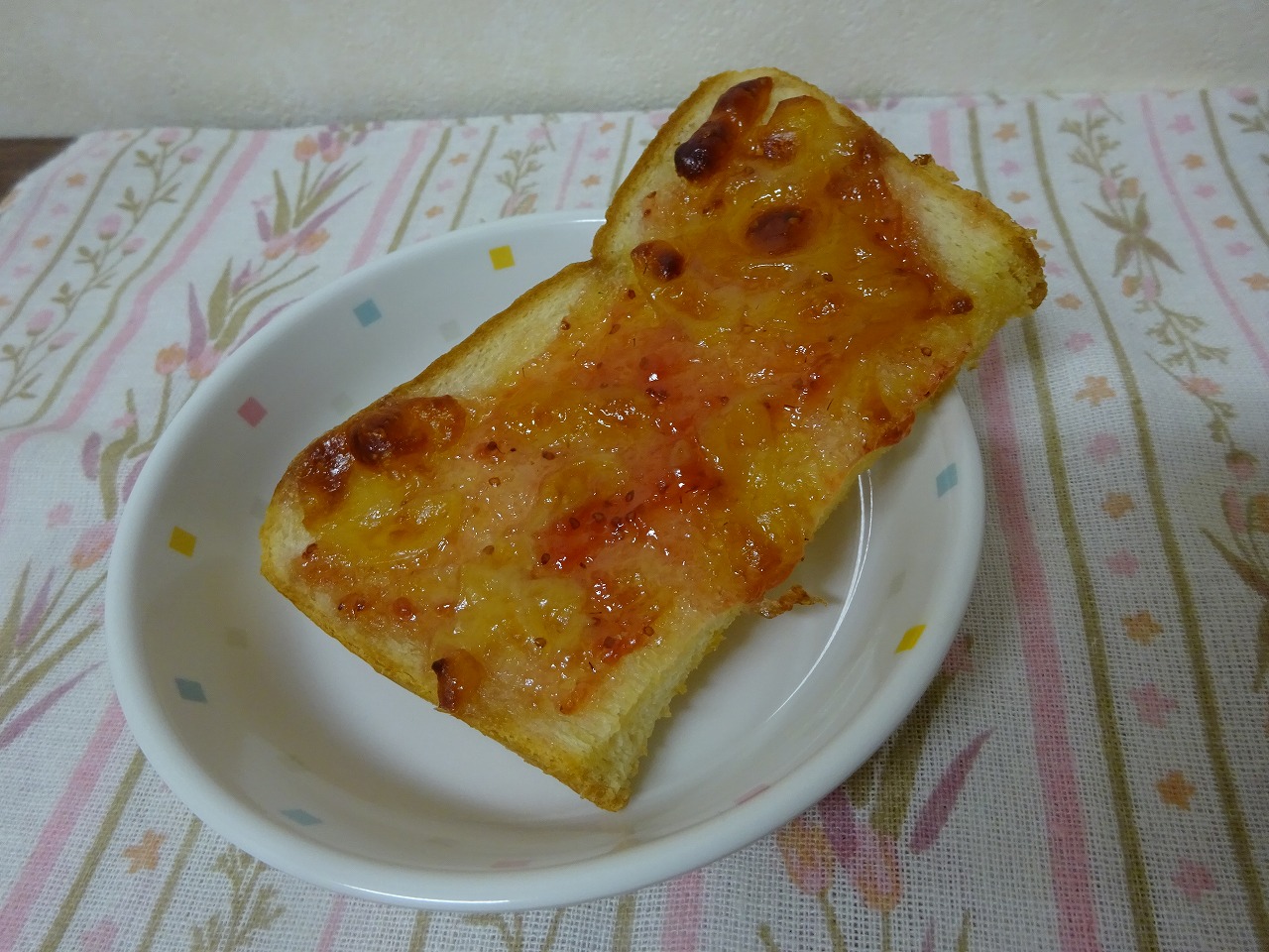 おやつ「いちごタルト風トースト」 いちごジャムとマーガリンとチーズを混ぜてから、 食パンの上に塗って焼きました! いちごタルト風の甘じょっぱいトーストになりました。