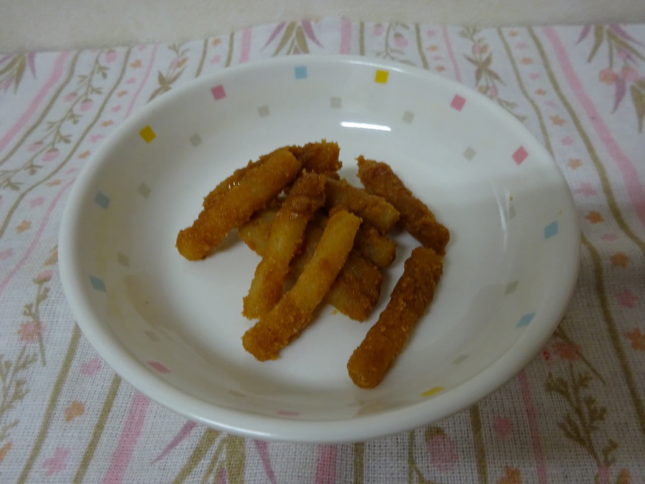 今日のおやつ「マカロニあべかわ」 茹でたマカロニに、きなこと砂糖を混ぜ合わせたものを和えた 簡単なおやつです。