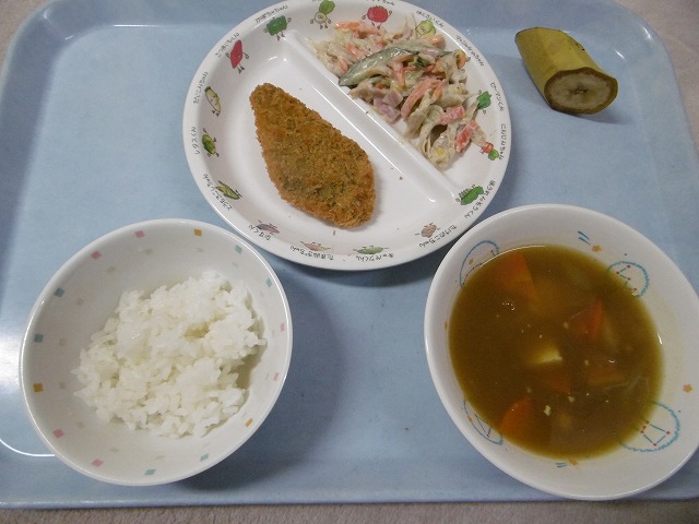 11月20日(火)給食 ・ごはん ・白身魚フライ(ホキ) ・ごぼうサラダ(ごぼう・にんじん・キャベツ・きゅうり・ハム・コーン) ・豆腐カレー汁(豆腐・玉ねぎ・にんじん・しめじ) ・バナナ