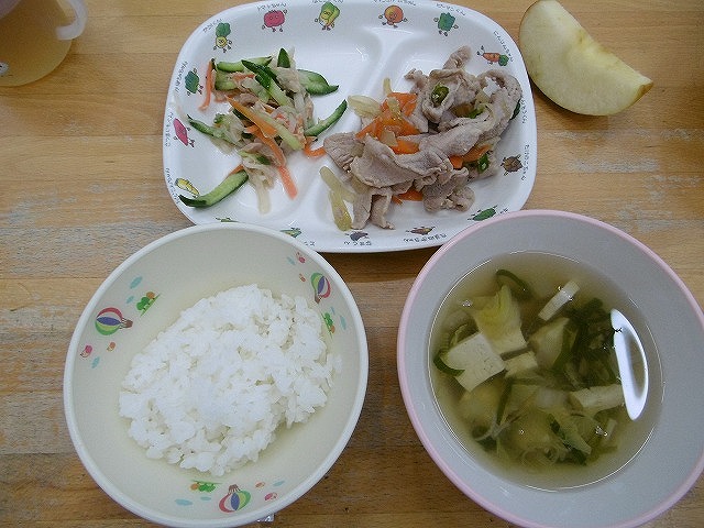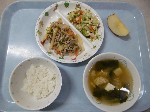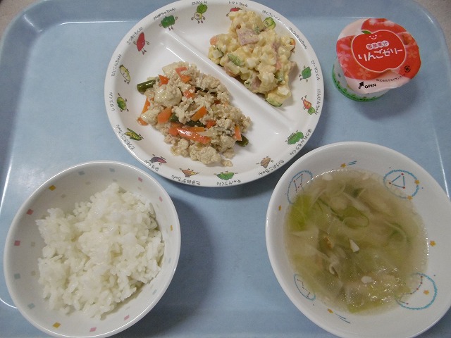 11月22日(木)給食 ・ごはん ・豚肉とピーマンのソテー(豚肉・ピーマン・にんじん・たけのこ・フライドポテト) ・チーズサラダ(チーズ・キャベツ・きゅうり・にんじん) ・みそ汁(豆腐・油揚げ・じゃがいも・玉ねぎ・わかめ・みそ) ・りんご