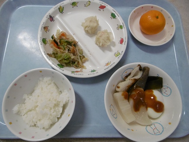 12月5日(水)給食 ・ごはん ・みそおでん(だいこん・卵・こんにゃく・ちくわ・こんぶ) ・キャベツのおかかあえ(キャベツ・きゅうり・にんじん・もやし) ・えびシューマイ ・みかん