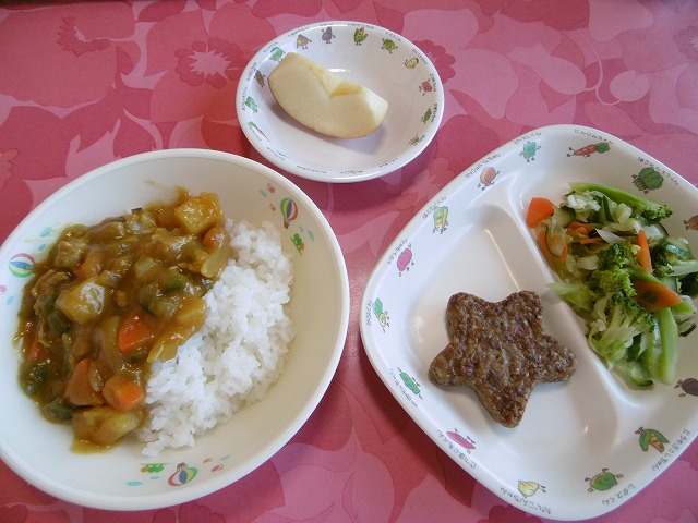 12月10日(月)給食 ・カレーライス(米・豚肉・玉ねぎ・にんじん・ピーマン) ・星のハンバーグ ・ブロッコリーサラダ(ブロッコリー・キャベツ・きゅうり・にんじん) ・りんご