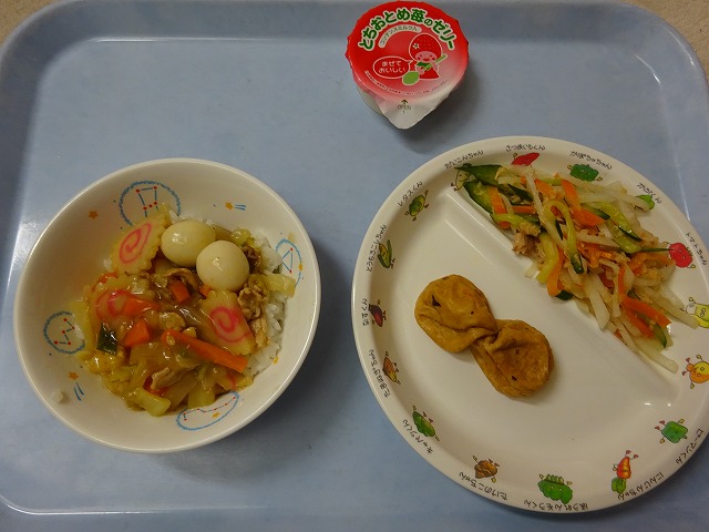 5月21日(月)給食 ・中華どんぶり(米・豚肉・えび・はくさい・にんじん・玉ねぎ・なると・干ししいたけ) ・だいこんサラダ(だいこん・きゅうり・にんじん・ツナ) ・がんもどきの煮物 ・とちおとめ苺ゼリー