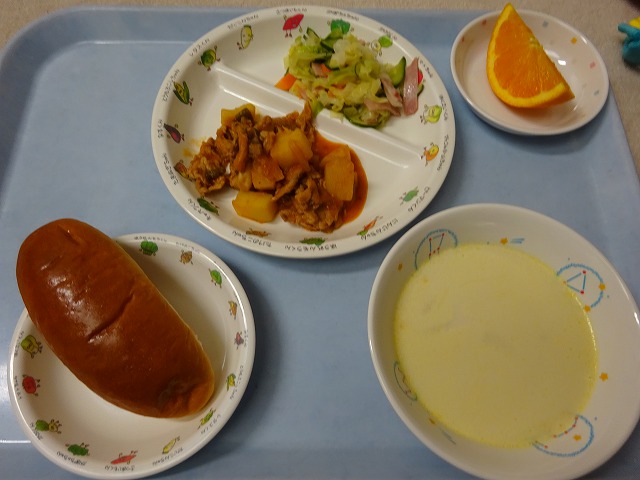 5月22日(火)給食 ・ロールパン ・ポークケチャップ(豚肉・玉ねぎ・じゃがいも・しめじ・ピーマン) ・フレンチサラダ(キャベツ・きゅうり・にんじん・ハム) ・コーンポタージュ(コーン・玉ねぎ・牛乳・バター・生クリーム・パセリ) ・オレンジ
