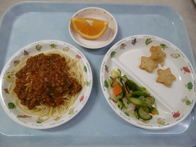 5月29日(火)給食 ・ミートスパゲティ(麺・豚ひき肉・玉ねぎ・にんじん・ピーマン・マッシュルーム) ・アスパラサラダ(グリーンアスパラ・キャベツ・きゅうり・にんじん) ・星ポテト ・オレンジ