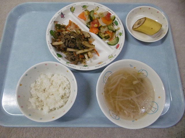 5月31日(木)給食 ・ごはん ・牛肉とピーマン炒め(牛肉・ピーマン・にんじん・たけのこ・フライドポテト) ・キャベツの中華和え(キャベツ・きゅうり・にんじん・コーン・トマト) ・コンソメスープ(ベーコン・玉ねぎ・もやし・わかめ) ・バナナ