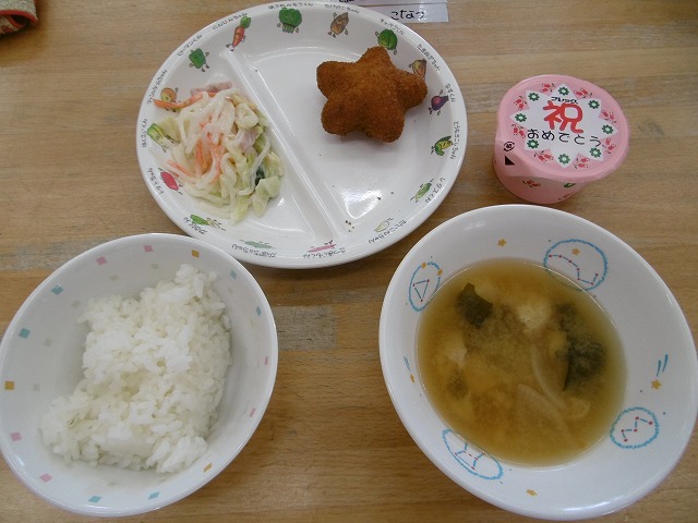 4月12日(木) 給食 ・ごはん ・星のコロッケ ・シルバーサラダ(マロニー・キャベツ・きゅうり・にんじん・ハム) ・みそ汁(豆腐・油揚げ・だいこん・ねぎ・わかめ・みそ) ・お祝い紅白ゼリー