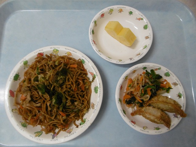 4月13日(金)給食 & おやつ ・焼きそば(麺・豚肉・キャベツ・玉ねぎ・にんじん・ピーマン・あおのり) ・ほうれん草のおひたし(ほうれん草・もやし・にんじん・かつお節) ・揚げギョウザ ・パイナップル