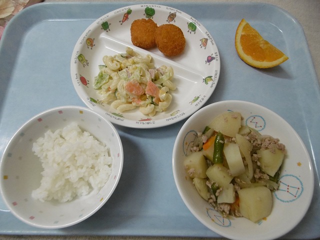4月16日(月)給食 ・ごはん ・じゃがいものそぼろ煮(じゃがいも・豚ひき肉・玉ねぎ・にんじん・いんげん) ・マカロニサラダ(マカロニ・キャベツ・きゅうり・にんじん・ハム・コーン) ・ほたて風フライ ・オレンジ