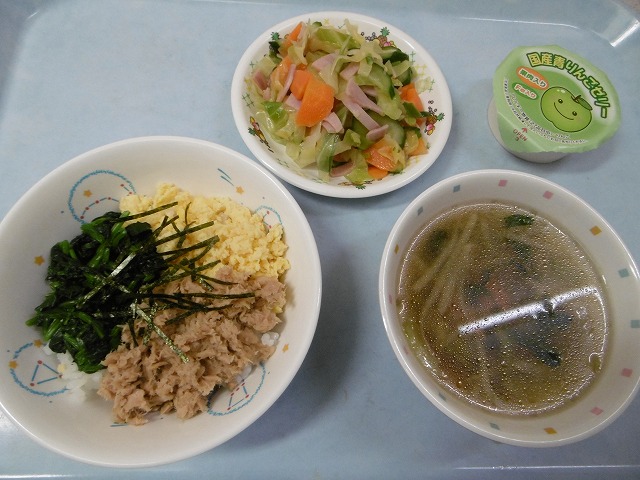 4月23日(月)給食 ・三色どんぶり(米・ツナ・卵・ほうれん草・のり) ・中華あえ(キャベツ・きゅうり・にんじん・ハム) ・もやしスープ(もやし・チンゲン菜・玉ねぎ・にんじん) ・青りんごゼリー