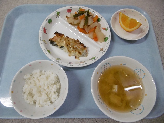 4月24日(火)給食 ・ごはん ・鮭のマヨドレ焼き(鮭・玉ねぎ・マヨ) ・大根の煮物(大根・にんじん・油揚げ・ちくわ・いんげん) ・みそ汁(豆腐・はくさい・えのきたけ・ねぎ・みそ) ・オレンジ