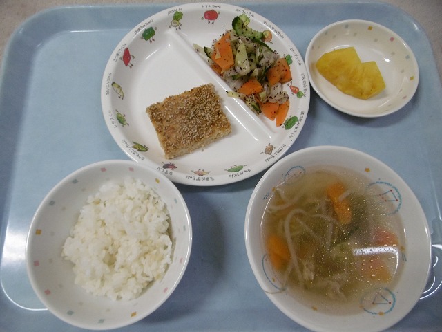 4月17日(火)給食&おやつ ・ごはん ・さわらの西京焼き ・いろどりソテー(ウインナー・キャベツ・玉ねぎ・ピーマン・にんじん・フライドポテト) ・白菜スープ(白菜・玉ねぎ・もやし・にんじん) ・プルーン おやつは、『ヨーグルトあえ』 みかん・パイン・もも・バナナ・レーズン・ヨーグルト