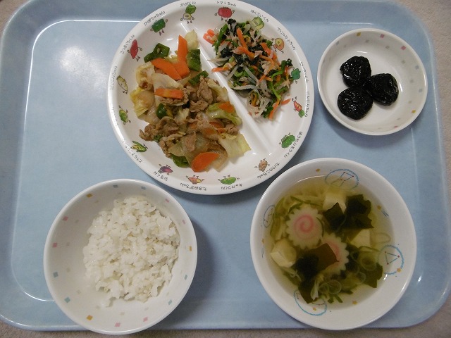 10月18日(水)給食 ・ごはん ・豚肉のみそ炒め(豚肉・キャベツ・にんじん・たまねぎ・ピーマン・みそ) ・ほうれん草の酢あえ(ほうれん草・にんじん・もやし・ツナ) ・すまし汁(豆腐・なると・えのきたけ・ねぎ・わかめ) ・プルーン