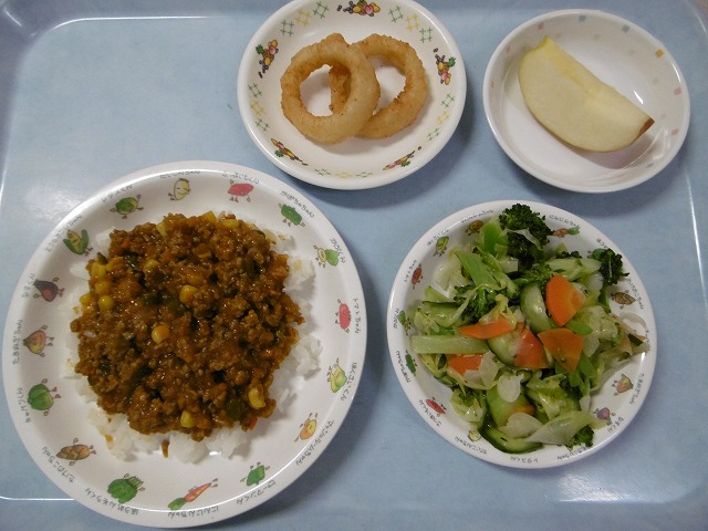 11月6日(月)給食 ・ドライカレー(米・合挽肉・玉ねぎ・にんじん・ピーマン・コーン) ・フレンチサラダ(ブロッコリー・キャベツ・きゅうり・にんじん) ・オニオンリング ・りんご