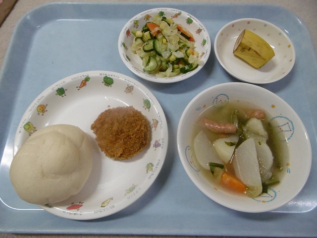 11月15日(水)給食 ・白いロールパン ・ハムカツ ・コーンサラダ(コーン・キャベツ・きゅうり・にんじん) ・ポトフ(ウインナー・かぶ・じゃがいも・玉ねぎ・にんじん・いんげん) ・バナナ