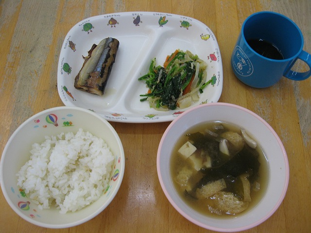 9月14日(木)給食 ・ごはん ・焼き魚(塩さんま) ・ほうれん草のごまあえ(ほうれん草・キャベツ・にんじん・もやし・ごま) ・みそ汁(豆腐・油揚げ・しいたけ・ねぎ) ・チーズ