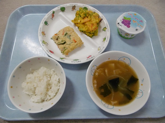 9月22日(金)給食 ・ごはん ・ぎせい豆腐(豆腐・卵・鶏ひき肉・にんじん・ねぎ・しいたけ) ・かぼちゃサラダ(かぼちゃ・きゅうり・にんじん・コーン・マヨネーズ) ・みそ汁(じゃがいも・油揚げ・玉ねぎ・わかめ・みそ) ・ぶどうゼリー