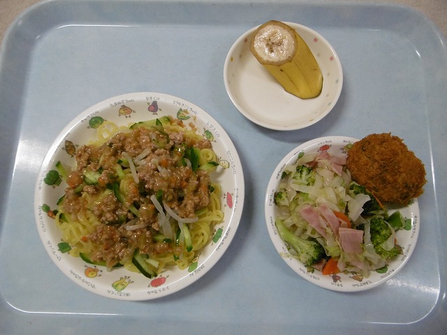 9月27日(水)給食 ・ジャージャー麺(麺・豚挽肉・玉ねぎ・にんじん・きゅうり・もやし) ・ひじきコロッケ ・ブロッコリー中華あえ(ブロッコリー・キャベツ・にんじん・ハム) ・バナナ