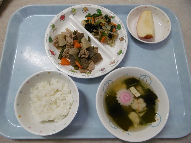 10月2日(月) 給食 ・ごはん ・豚肉と大根のべっこう煮(豚肉・だいこん・にんじん・こんにゃく・いんげん) ・おひたし(ほうれん草・キャベツ・にんじん・もやし・かつお節) ・すまし汁(豆腐・なると・麩・ねぎ・わかめ) ・りんご