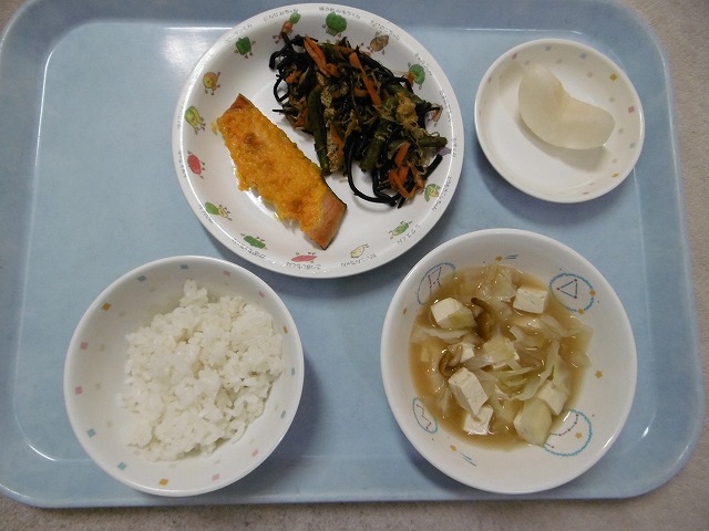 10月3日(火)給食 ・ごはん ・鮭のもみじ焼き(鮭・にんじん・マヨネーズ) ・ひじきの五目煮(ひじき・油揚げ・にんじん・しらたき・いんげん) ・みそ汁(豆腐・なめこ・玉ねぎ・キャベツ・みそ) ・なし