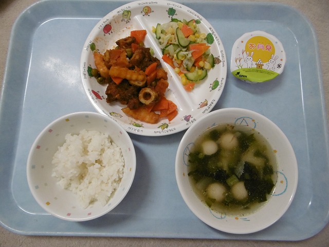 10月4日(水)給食 ・ごはん ・かしわのノルウェー煮(鶏肉・ポテト・ちくわ・にんじん・グリンピース) ・コーンサラダ(コーン・キャベツ・きゅうり・にんじん) ・おつきみスープ(ウズラ卵・かまぼこ・こまつな・玉ねぎ) ・ゼリー