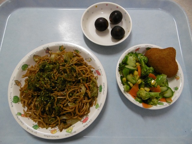 10月6日(金)給食 ・焼きそば(中華めん・豚肉・キャベツ・にんじん・ピーマン・玉ねぎ・青のり) ・ブロッコリー中華あえ(ブロッコリー・きゅうり・にんじん・コーン) ・焼き栗コロッケ ・きょほう