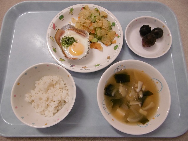 8月8日(火)給食 ・ごはん ・ベーコンエッグ(ベーコン・卵・青のり) ・チップスサラダ(ポテトチップス・キャベツ・きゅうり・にんじん) ・みそ汁(豆腐・油揚げ・玉ねぎ・しいたけ・わかめ) ・きょほう