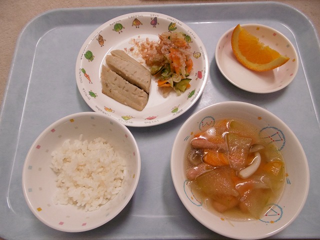 8月9日(水)給食 ・ごはん ・さわらの西京焼き ・キャベツの梅かつおあえ(キャベツ・きゅうり・にんじん・梅びしお・かつお節) ・とうがんスープ(とうがん・ウインナー・玉ねぎ・にんじん・しめじ) ・オレンジ
