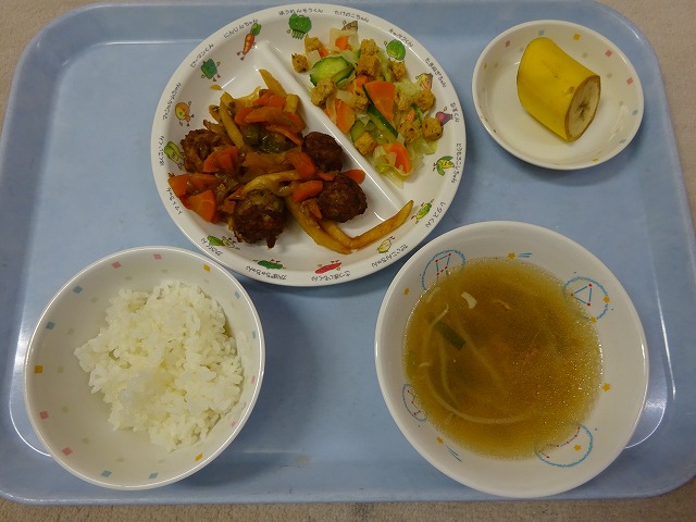 8月28日(月) 給食 ・ごはん ・ミートボールの甘辛煮(合挽肉・玉ねぎ・卵・パン粉・ポテト・にんじん・ピーマン) ・クルトンサラダ(キャベツ・きゅうり・にんじん・クルトン) ・コンソメスープ(ベーコン・玉ねぎ・もやし・しめじ) ・バナナ