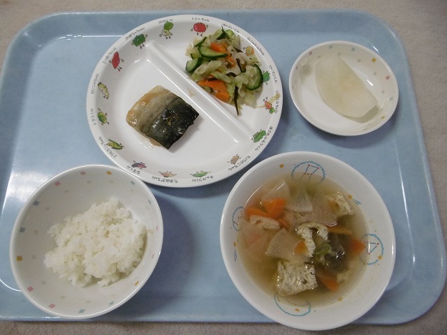 8月31日(木)給食 ・ごはん ・さばのみそ煮 ・キャベツの塩昆布あえ(キャベツ・きゅうり・にんじん・塩昆布) ・五目汁(鶏肉・油揚げ・だいこん・にんじん・こんにゃく・ねぎ) ・なし