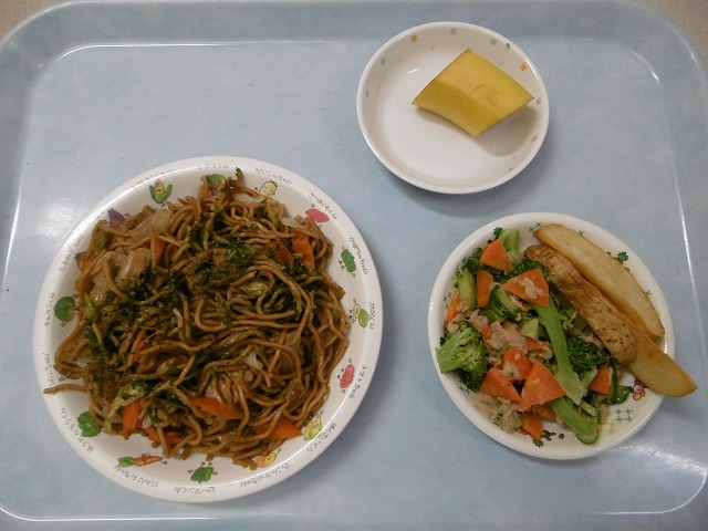 9月8日(金)給食 ・焼きそば(中華めん・豚肉・キャベツ・玉ねぎ・にんじん・ピーマン) ・ブロッコリーサラダ(ブロッコリー・ツナ・きゅうり・にんじん) ・フライドポテト ・バナナ